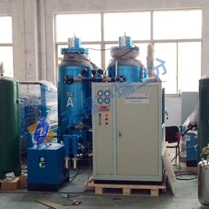 液氮機設備是根據變壓吸附原理,采用高品質的碳分子篩作為吸附劑,在一定的壓力下,從空氣中制取氮氣。經過凈化干燥的壓縮空氣,在吸附器中進行加壓吸附、減壓脫附。由于動力學效應,氧在碳分子篩微孔中擴散速率遠大于氮,在吸附未達到平衡時,氮在氣相中被富集起來,形成成品氮氣。然后減壓至常壓,吸附劑脫附所吸附的氧氣等其它雜質,實現再生。一般在系統中設置兩個吸附塔,一塔吸附產氮,另一塔脫附再生,通過PLC程序自動控制,使兩塔交替循環工作,進行氧氮吸附分離,從而得到合格的氮氣,再進入風冷無油循環壓縮機和液化設備,使氮氣從氣態變換成液態得到液態氮。