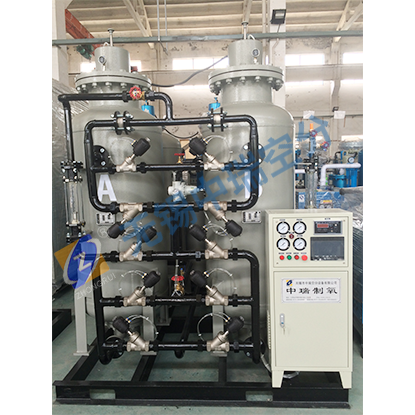 工藝原理:變壓吸附制氧裝置以潔凈的壓縮空氣為原料,沸石分子篩為吸附劑,利用變壓吸附的原理在常溫下來獲取氧氣。根據(jù)空氣中氧、氮在沸石分子篩表面的吸附量的差異及氧和氮在沸石分子篩中的擴散速率不同,通過可編程序控制器控制氣動閥的啟閉,實現(xiàn)加壓吸附、減壓脫附的過程,完成氧、氮分離,得到所需純度的氧氣。